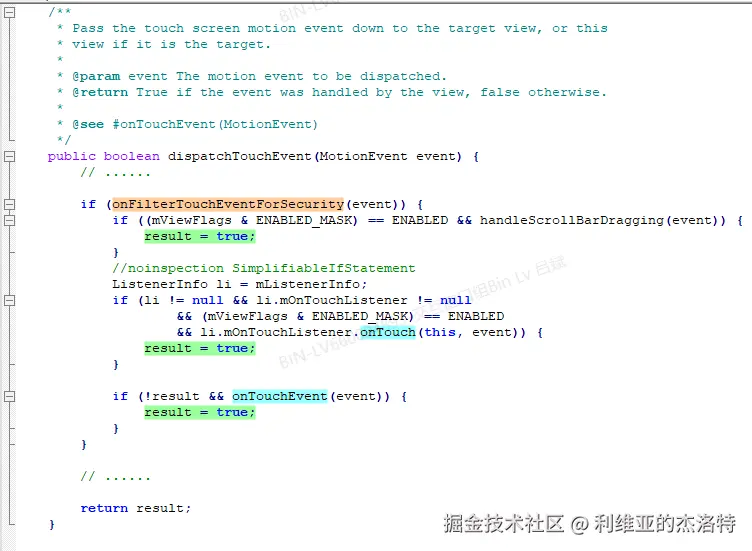 既然事件已经传到了SecureButton了,那么再看具体的View类处理MotionEvent的代码,View.dispatchTouchEvent:
