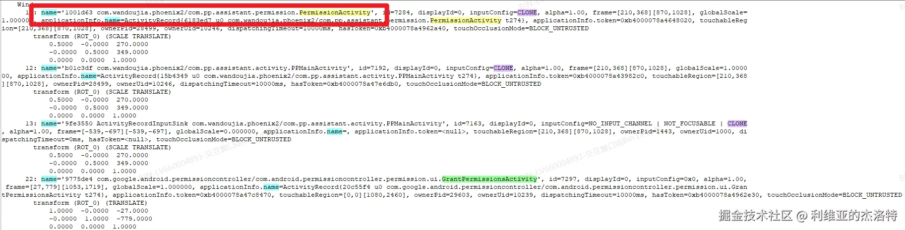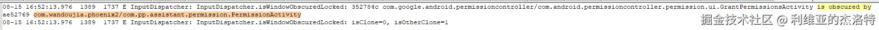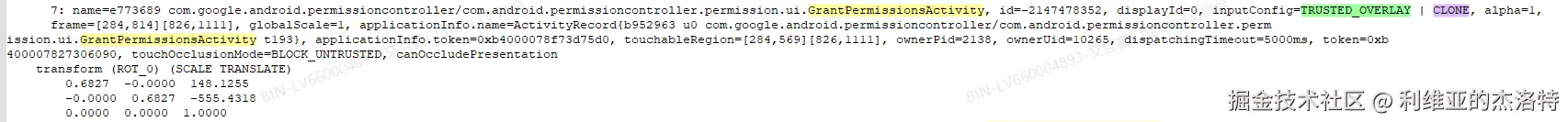 根据我添加的log,看到遮挡的WindowInfoHandle为请求权限弹窗的那个界面窗口克隆出的窗口,被遮挡的自然就是权限弹窗:
