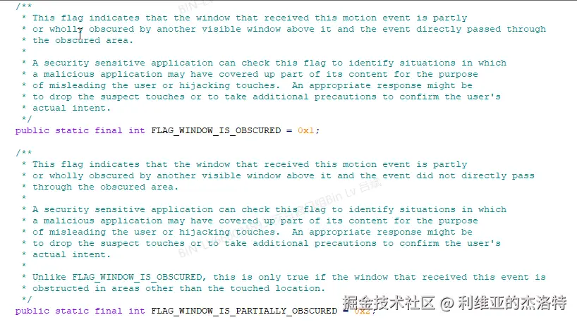 FLAG_WINDOW_IS_OBSCURED和FLAG_WINDOW_IS_PARTIALLY_OBSCURED都表示接收MotionEvent的窗口被另外一个位于它之上的可见窗口遮挡了,但是不同点的是: