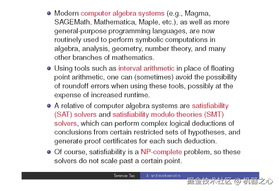 另一种已变得相当强大的科学计算是所谓的 SAT 求解器。它们基本上可以解决逻辑难题。比如,如果你有 10 个陈述或者 1000 个陈述都是真的或假的,而你知道,如果第 3 个陈述是真的,第 6 个陈述是真的,那么第 7 个陈述一定是假的。如果给你一大堆这样的限制条件,SAT 求解器就会尝试接受所有这些信息,然后总结:你能证明这些句子的某种组合吗?