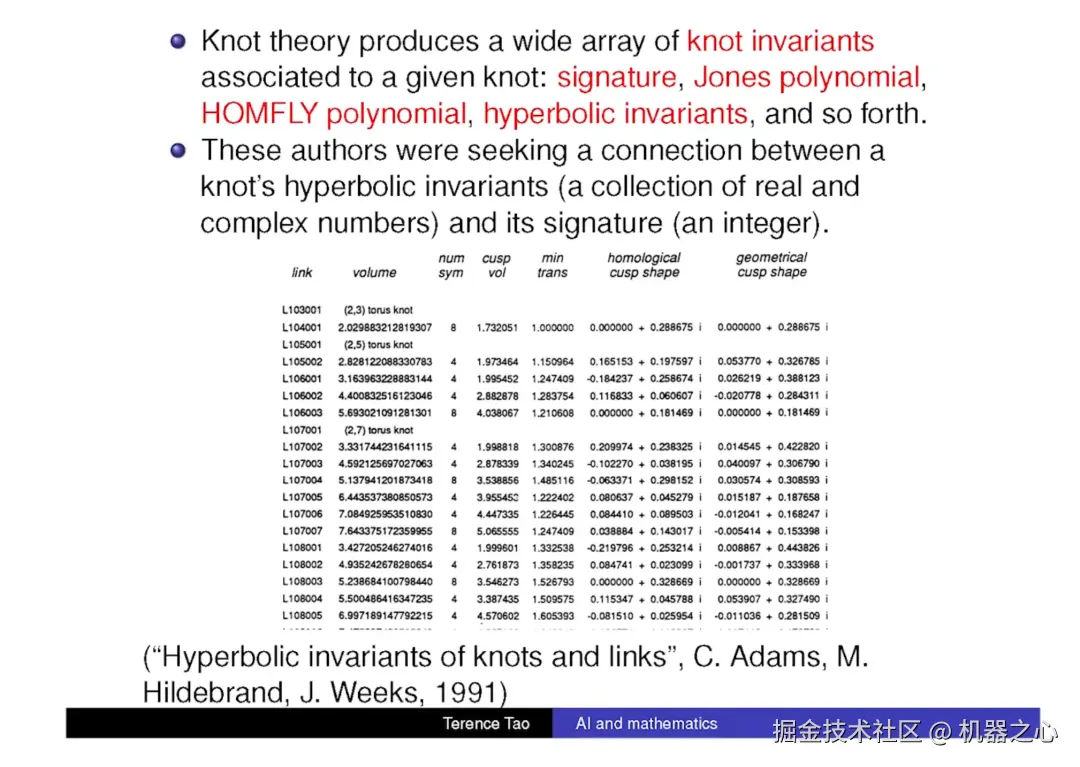 直到最近,人们才开始使用机器学习来解决这个问题。他们创建了数百万个结的数据库,并用这些数据训练了一个神经网络。结果发现,训练后的神经网络,可以根据所有的双曲几何不变量来预测签名,大约 90% 的时候它可以猜对。