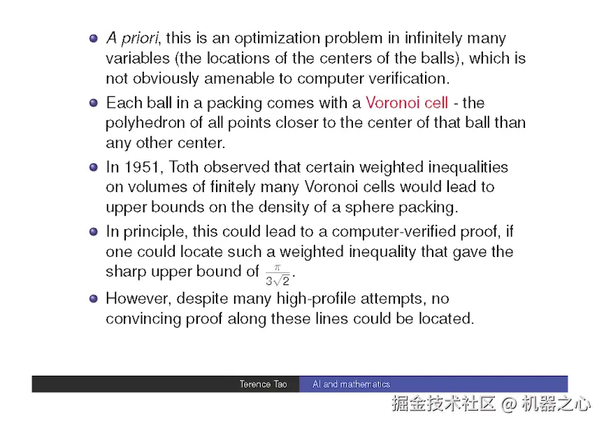 这些评分基于体积并进行了微调,目标是通过线性不等式约束不同单元的得分,最终计算出密度的最大值,从而得出开普勒猜想在三维中的答案。