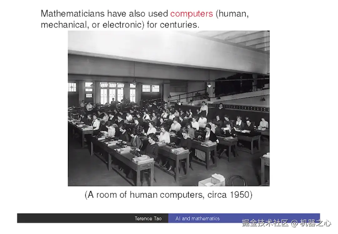 计算机呢?我们用计算机做数学题有多久了?大约有 300 到 400 年。有点奇怪吧,因为现代计算机直到 20 世纪 30 年代和 40 年代才出现。在此之前,计算机并不是电子的,而是机械的,再之前,它们是「人类」。「计算机」实际上是一种职业,是「计算的人」。