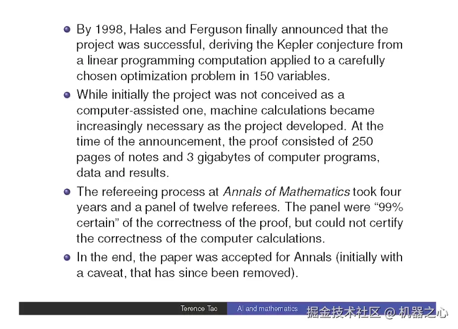 同时,使用计算机导致 Thomas Hales 的论文难以通过审查。Hales 把论文提交给了数学顶级期刊之一《数学年刊》(Annals of Mathematics),整个审稿过程持续了四年,审稿委员会包括 12 名审稿人。最终,他们表示 99% 地确定证明是正确的,但无法完全确认其中的所有计算。出于这种不确定性,编辑们采取了非常罕见的做法,发表了论文,并附上了一个来自编辑的保留说明,提醒读者有未完全验证的部分。不过后来,这个保留说明被移除了。
