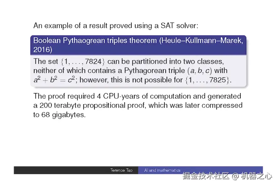 这个证明需要 7 个 CPU-year 计算。他们生成了 200 兆字节,后来被压缩到 68 千兆字节。这就是我们利用计算机进行大量案例分析的一种方式。
