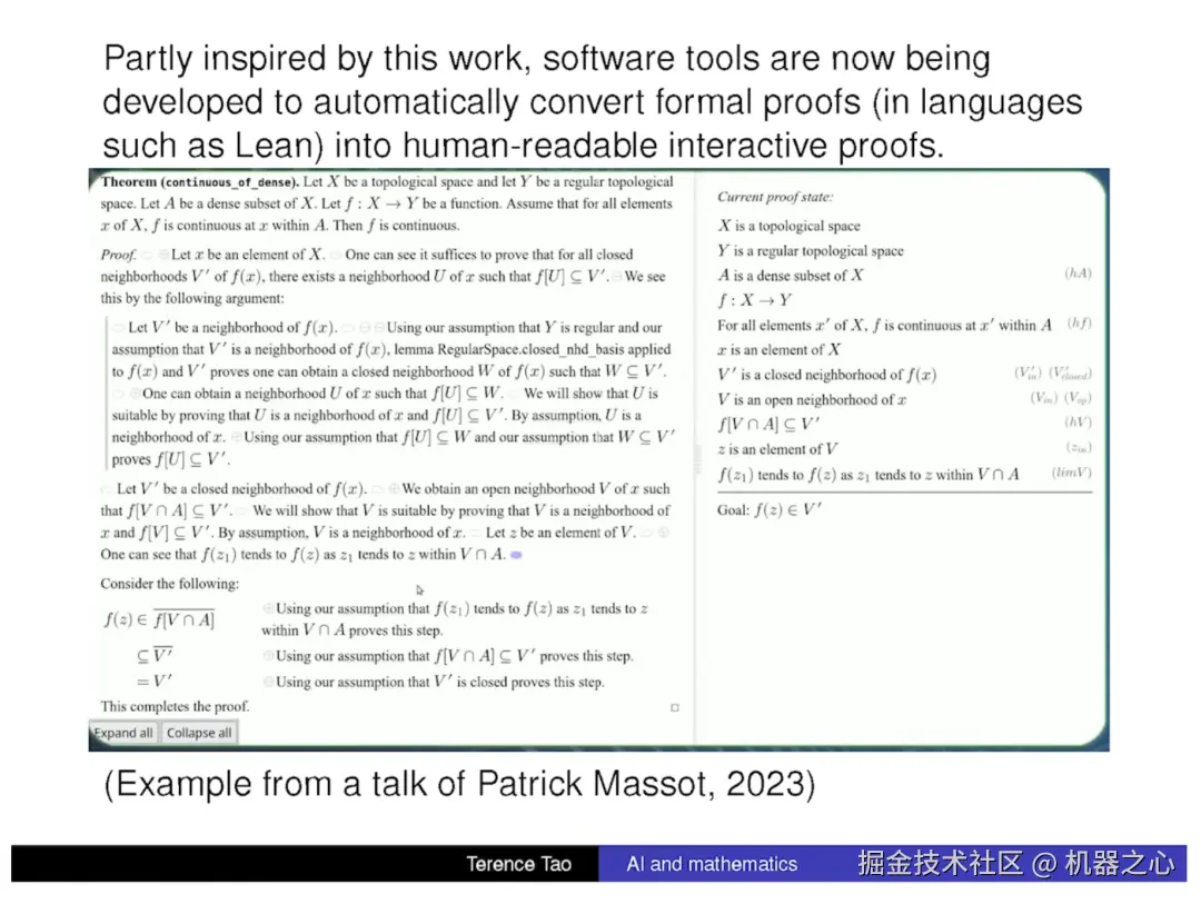 目前,人们正在致力于将这份长达数万行的形式化证明转换回人类可读的形式。为此,已经开发了一些新工具。例如,你可以将 Lean 的格式转换成人类可读的形式。这里有一个拓扑问题的例子。这里的所有文本都是计算机根据形式化证明自动生成的,看起来和一个人类写出来的没什么差别。
