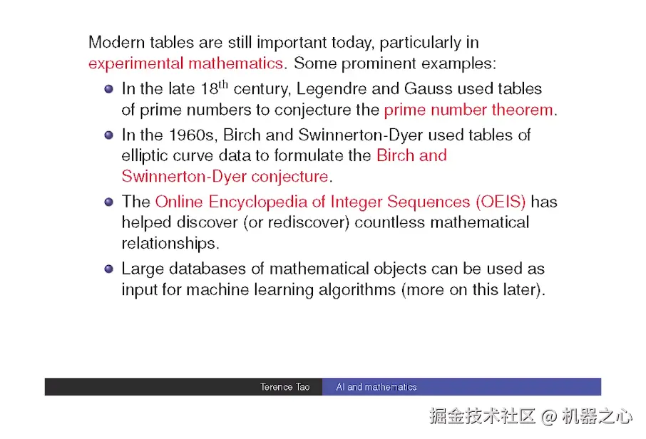 除了我们熟知的那种 AI 辅助「蛮力计算」之外,我认为还有一个特别令人兴奋的方向。尽管目前还没有真正成功,但是 AI 已经非常擅长生成猜想。我们已经看到了一些例子,AI 已经可以推测两个统计数据之间的联系。所以现在我们寄希望于创建庞大的数据集,将大量数据「喂」给 AI,然后它们就会自动生成各种数学对象间的联系。其实这还并没有实现,我们还不清楚如何做到这一点。当然,我们还没做出那种大体量的数据集。但我认为 AI 能生成数学猜想在将来很有可能成为现实。