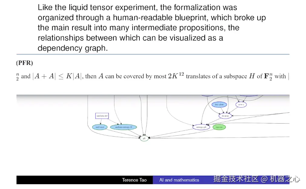 这个证明大约有 33 页,我们在相对较短的时间内完成了它的形式化,可能依然是最快形式化的研究论文。用了三周时间,团队有 20 人左右,利用了所有已经开发出来的蓝图工具完成了这一切。总的来说,这种方法让证明过程更加开放和协作化。而且你还能获得很多漂亮的可视化图表。正如我之前提到的,第一步是把你的大定理拆解成许多小部分。我们有一个定理,称为 PFR,接下来我们会解释为什么。在这张图的底部,有一个表示「宇宙」的小气泡。