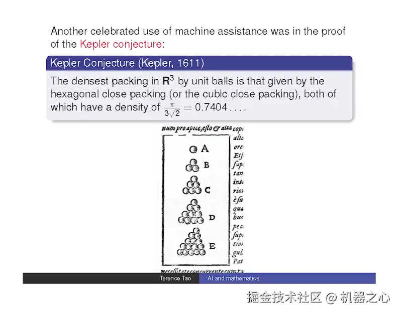为期一个小时的演讲中,他从早期计算工具讨论到现代机器学习和形式化证明助手的演变过程,还着重介绍了最近取得的突破和面临的挑战。陶哲轩强调,虽然人工智能在数学领域的作用越来越大,但人类的洞察力和创造力对于在该领域取得有意义的进展仍然至关重要。