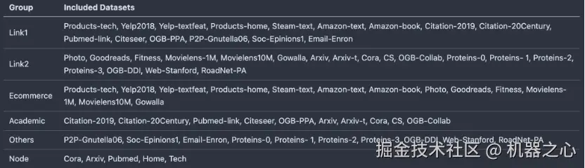 AnyGraph 采用了共 38 个数据集进行训练和测试,数据集涵盖了电商、学术网络、生物信息网络、交通网络、网页关联网络、社交网络等多个类别。共包括 14,437,372 个节点和 199,265,688 条边。不同数据集采用的节点特征方法不同,囊括了无节点特征、不同的文本 embedding 方法、词袋特征、类别特征等不同的方法。具体数据集统计信息如下所示