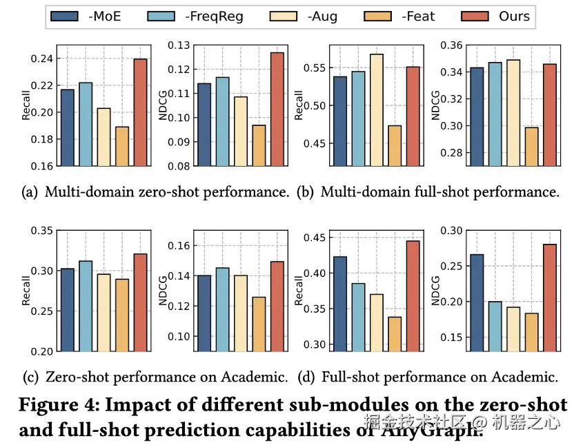 AnyGraph 的零样本能力遵循 Scaling Law:虽然模型的全样本预测能力出现了增长的饱和,但其零样本能力随着参数量和数据量的增长不断上升,这说明 AnyGraph 模型的零样本能力遵循 Scaling Law,这一观测结果有两个重要原因,首先是测试的任务需要具备一定的难度,全样本预测只需要模型在训练数据集上具备泛化能力,相对较为简单,因此容易出现性能增长的饱和;而跨数据集、跨领域的零样本预测挑战性高,仍有很大的增长空间。其次,AnyGraph 的 MoE 架构使得它更容易容纳不同数据集的多样化图数据模式,从而具备更大的潜力随着参数量和数据量的增大而提升。