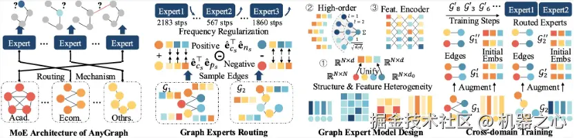 具体来说,AnyGraph 的 MoE 架构包含多个图数据专家模型,每个专家模型均能对所有输入的图数据进行处理和预测,但所擅长的领域和模式不同。例如,有的专家模型擅长处理文本 embedding 特征,有的擅长处理图的邻接矩阵特征;有的专家模型擅长处理稠密数据,而有的擅长处理稀疏数据。
