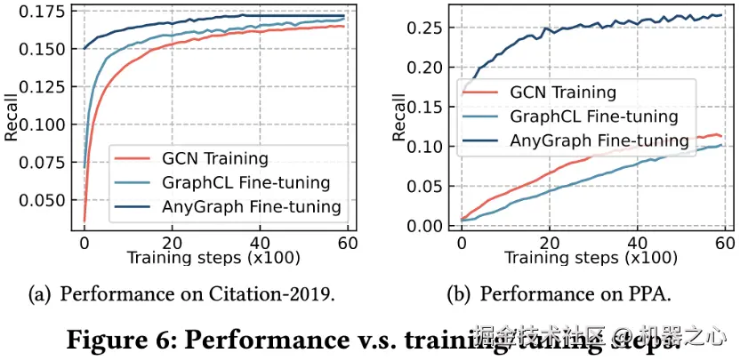 此外,文章进一步探究了不同模型在应对新数据时的快速适应能力。下图实验对比了三种方法随着训练步数的增加,在训练数据集上性能的提升曲线。实验对比的方法包括对一个随机初始化的 GCN 模型进行从头训练、对一个预训练的 GraphCL 模型进行微调、以及对预训练的 AnyGraph 进行微调。
