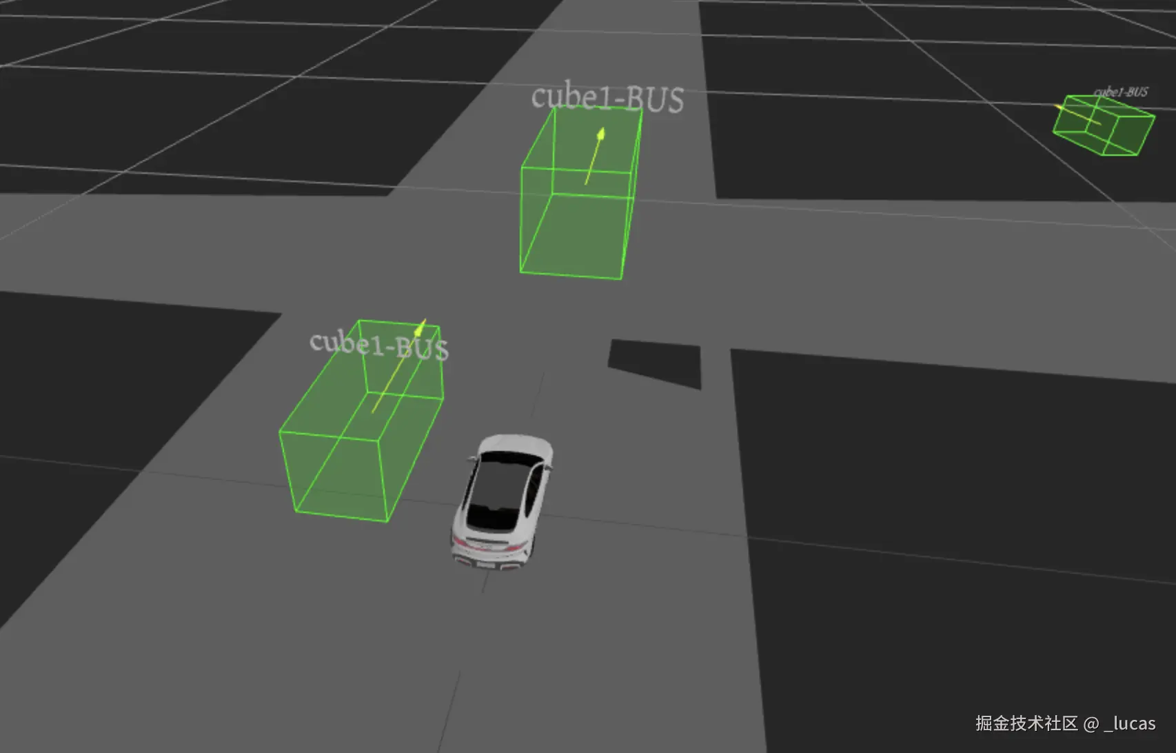 其实可以把他车、文字和朝向箭头做成一个 Group,好处是减少 drawcall 和便于一起操作,比如移动、旋转和缩放等。Cube对象修改代码参考如下: