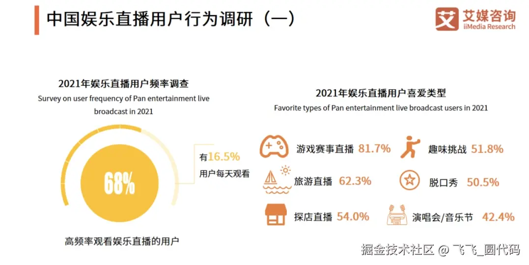 从受众用户角度来看,据艾媒数据显示,2021年中国直播用户主要观看的直播类型分别为:电商直播占比60.8%,娱乐直播占比57.1%。其中娱乐直播主要就是游戏、游戏赛事直播,占比81.7%。