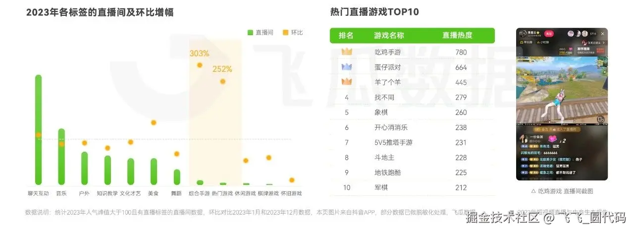 从赛道增长趋势来看,抖音直播保持着强劲的发展势头,2023年人均直播场次环比增长201%,抖音综合手游直播间环比增长超303%。