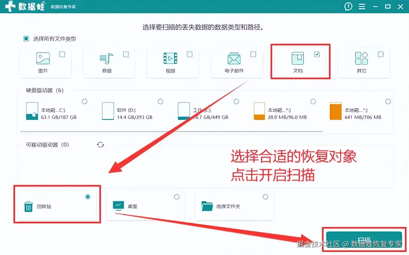 步骤2:在软件界面上,用户可以根据自己的需求选择合适的恢复对象。例如 【回收站】和【文档】 ,再进行扫描。
