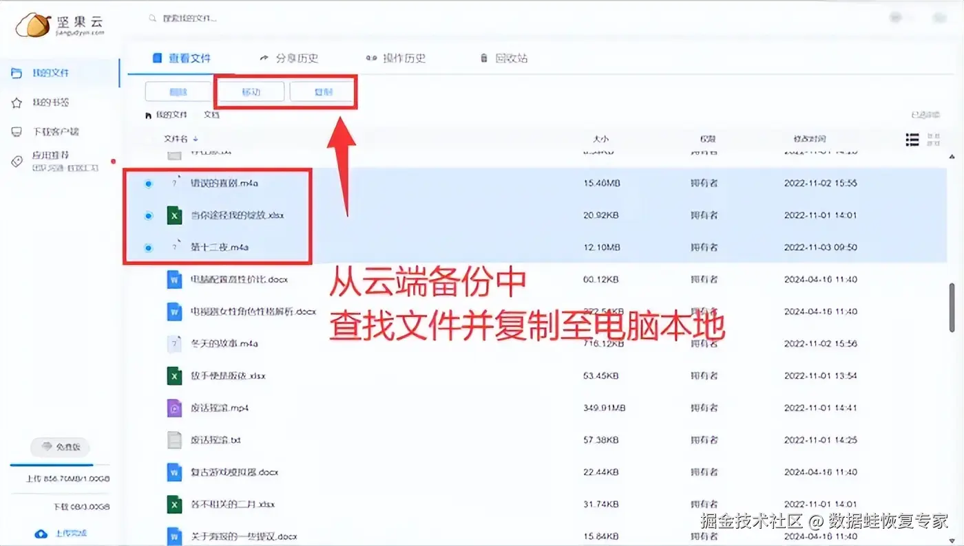 除了系统备份,很多人还会选择将电脑数据上传至云端进行存储,极大地保证了数据的安全性。如果你有使用云备份的习惯,不妨进入查找。一旦找到,即可选择文件,将它们复制或移动至电脑。