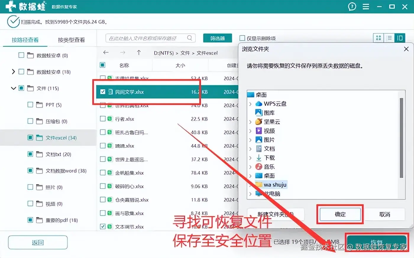 步骤3:扫描完成后,软件将列出所有可恢复的文件。用户可以通过文件名、文件类型等方式进行筛选和预览。最后,选择需要找回的文件,点击 【恢复】 ,在弹出框中选择合适的保存路径。