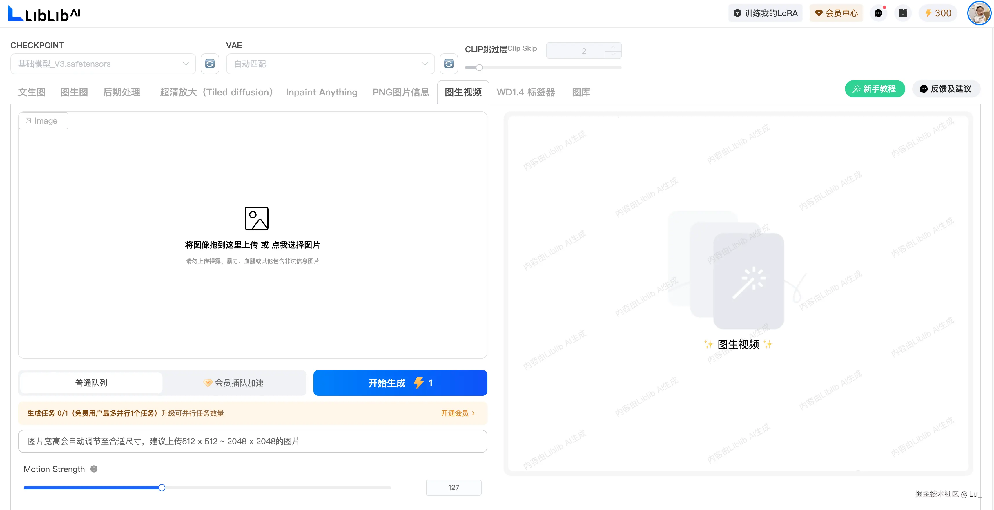 Liblib AI提供在线Stable Difusion图片生成、视频生成功能和海量的模型素材库,在图生视频领域效果质量一般。