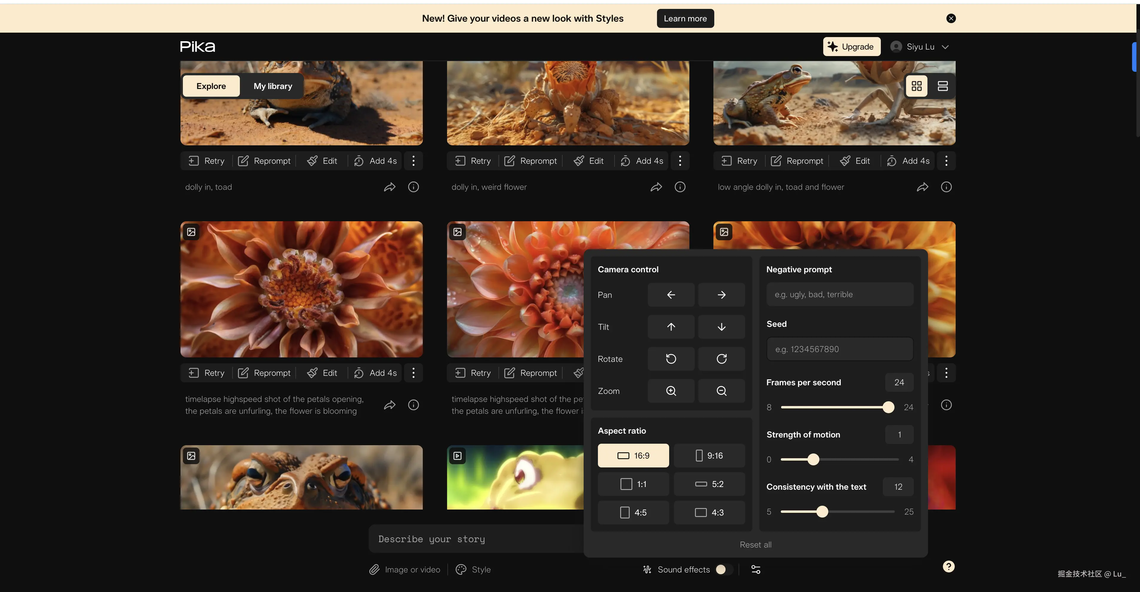 作为Sora 发售前Runway 的最有力竞争者,目前Pika的相关能力目前是最接近Runway的, 在部分操作在接近Runway的同时,Pika还较有特色的增加了对嘴型的功能。