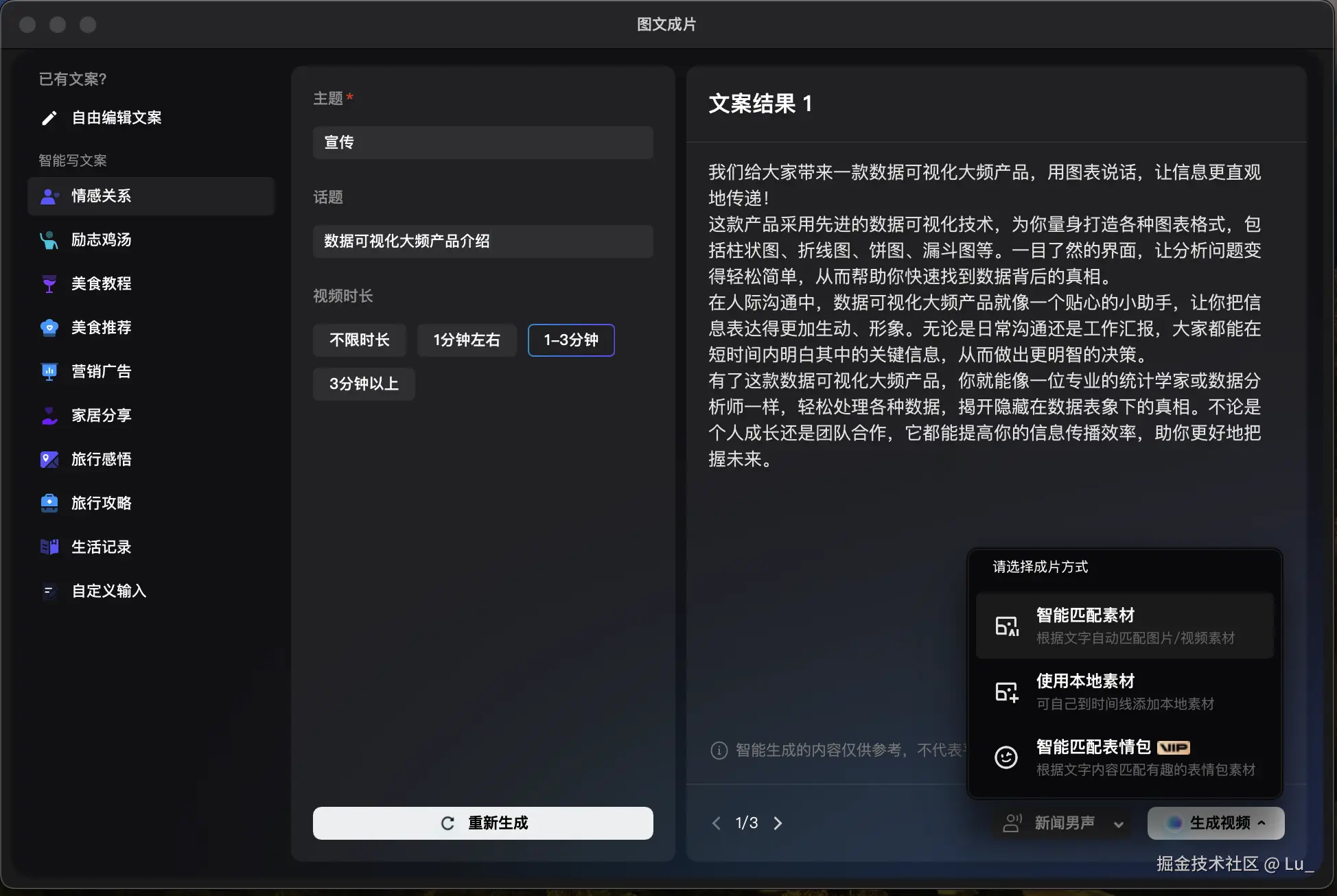 剪映 AI是通过自然语言处理与计算机机器视觉生成,会抓取网站上现有的视频片段进行整合生成,且会自动生成字幕和配音。
