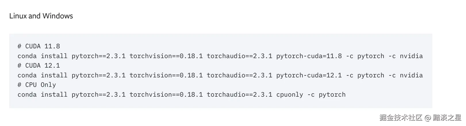 需要与本地的CUDA版本相匹配,可以到pytorch.org/get-started…中查看适合的版本