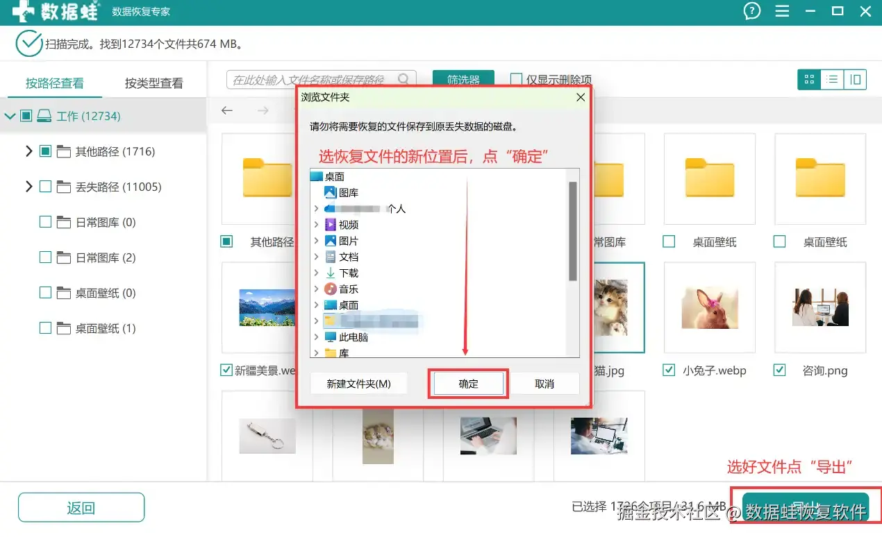 步骤3: 选好需要恢复的文件,然后点“导出”,在弹窗里选择恢复文件的存储位置(原位置之外的磁盘位置)就能完成数据恢复。