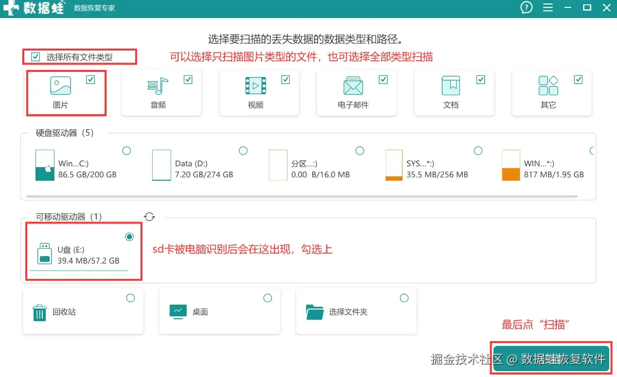 步骤1: 在官网上下载好数据 蛙恢复专家,打开后在首页选择好需要恢复的文件类型(可单选图片或选择全选)和需要扫描的sd卡(需提前连接好在电脑),完成后选“扫描”。