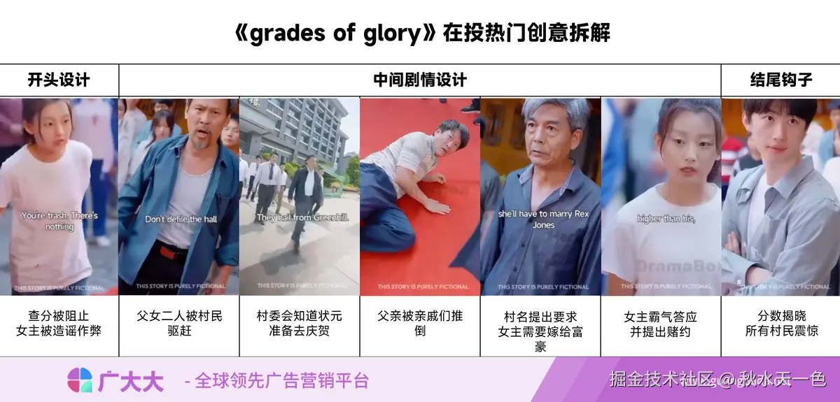 在国内取得不错的成绩后,《grades of glory》译制后转身出海,7月投放创意去重后高达2.6K条,可见平台方对其极具信心。投放素材中,热度较高的一条时长在7min40s,主要讲述的是陈秋兰高考之后查分但被亲戚们造谣作弊并逼其嫁人的故事,下图为素材剧情简要拆解。