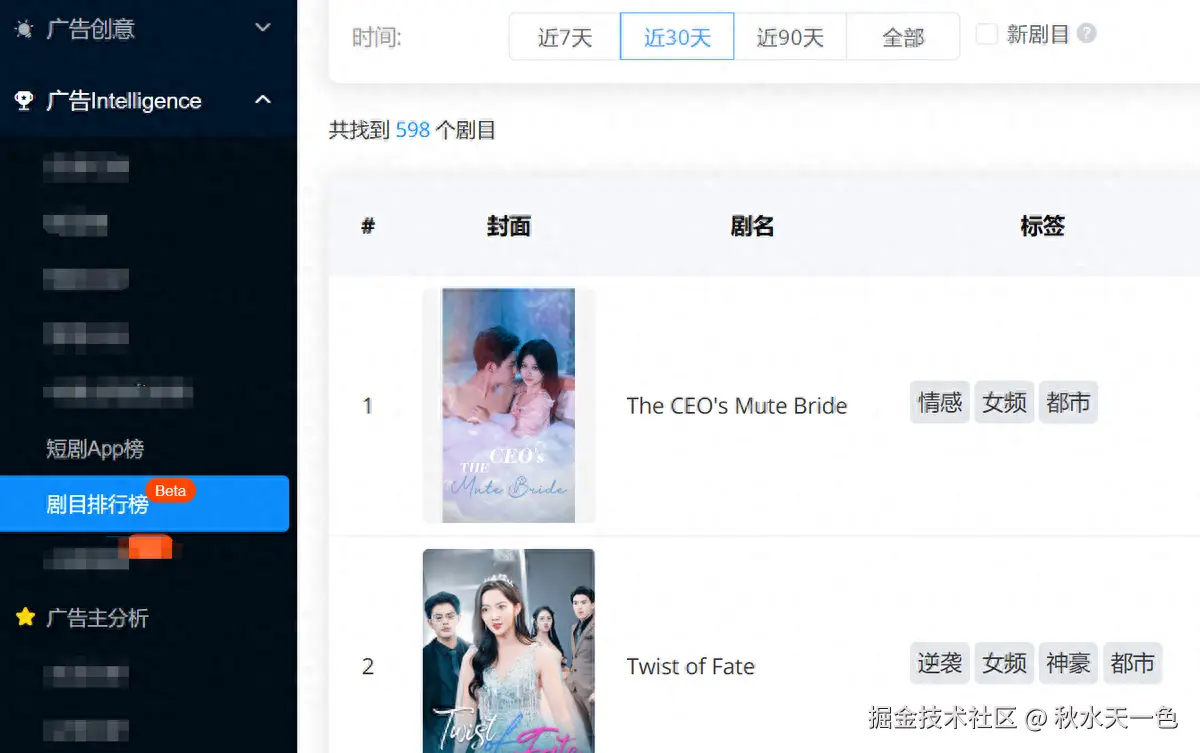 夏日炎炎,接近40度的气温下出海短剧的竞争则更加火热。为了帮助各位短剧玩家能在出海的航路上更加顺利,广大大最新推出了“剧目排行榜”来帮助各位了解市场上最为火热的出海剧目,时刻掌握最新短剧出海趋势(功能详情见广大大-广告-intelligence-剧目排行榜,目前为Beta测试版本,可联系商务获取试用资格)。