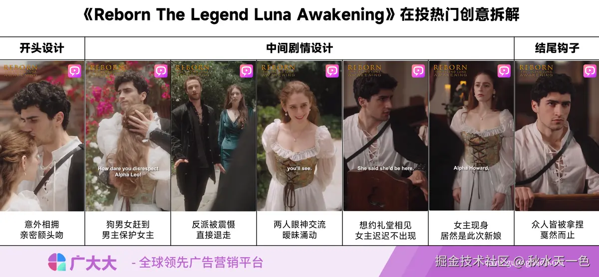 这类前妻复仇剧最早火起来可以追溯到当年的大爆剧《回家的诱惑》,在最近也有吴谨言和王星越主演的《墨雨云间》,仿佛永远不会过时;而在短剧的设计中,则将节奏加快,直接用“重生”戏码让剧情进入主题。根据广大大-展示广告功能对其关键词进行抓取,整理可得7月《Reborn The Legend Luna Awakening》的相关去重创意达到了4.4K条,约有超82.3%的创意投放在了欧美地区。