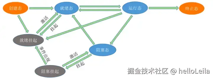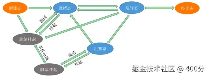 暂时换出外存等待的进程状态为挂起状态(挂起态,suspend),挂起态又可以进一步细分为就绪挂起、阻塞挂起两种状态