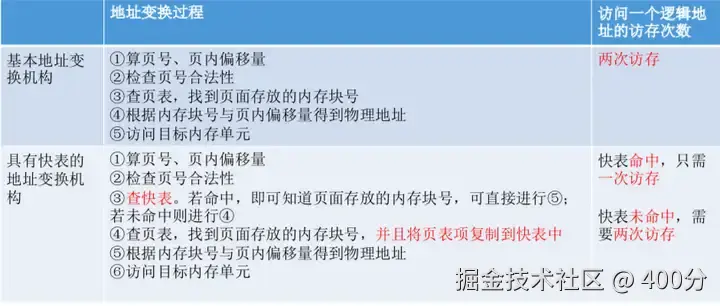 分页(单级页表):第一次访存——查内存中的页表,第二次访存——访问目标内存单元。总共两次访存