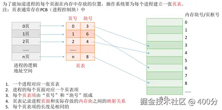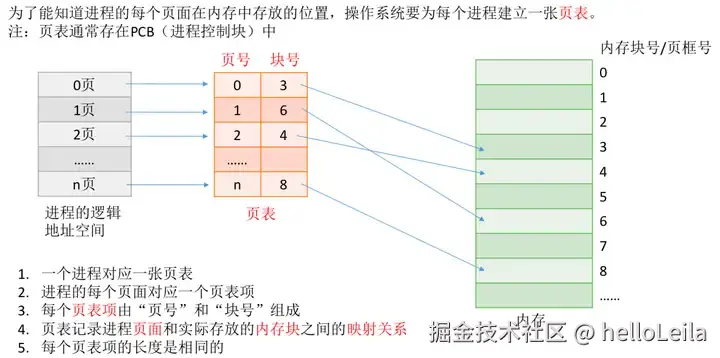 操作系统以页框为单位为各个进程分配内存空间。进程的每个页面分别放入一个页框中。也就是说,进程的页面与内存的页框有一一对应的关系。各个页面不必连续存放,可以放到不相邻的各个页框中。
