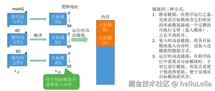 链接:由链接程序将编译后形成的一组目标模块,以及所需库函数链接在一起,形成一个完整的装入模块 逻辑地址