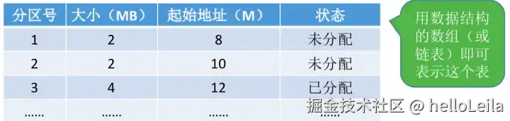 操作系统需要建立一个数据结构——分区说明表,来实现各个分区的分配与回 收。每个表项对应一个分区,通常按分区大小排列。每个表项包括对应分区的大小、起始地址、状态(是否已分配)