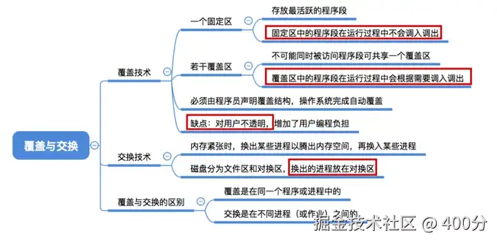 2:覆盖技术的思想:将程序分为多个段(多个模块)。常用的段常驻内存,不常用的段在需要时调入内存。内存中分为一个“固定区”和若干个“覆盖区”。需要常驻内存的段放在“固定区”中,调入后就不再调出(除非运行结束)不常用的段放在“覆盖区”,需要用到时调入内存,用不到时调出内存 缺点:缺点:对用户不透明,增加了用户编程负担,只用于早期的操作系统中。
