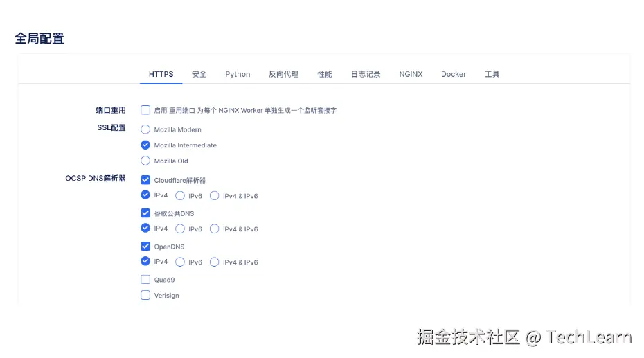 Nginx 是前后端开发工程师必须掌握的神器。该神器有很多使用场景:比如反向代理、负载均衡、动静分离、跨域等等。 把 Nginx 下载下来打开 conf 文件夹的 nginx.conf 文件,Nginx 服务器的基础配置和默认的配置都存放于此。 配置是让程序员非常头疼的事,比如 Java 后端框架 SSM,大量配置文件让不少人头皮发麻,所以才涌现了 Spring Boot 这样能简化配置的框架。 如果能够采用可视化的方式对 Nginx 进行配置,那该多好,后来在 GitHub 上发现了这款,可以一键生成 Nginx 配置的神器,相当给力 先来看看它都支持什么功能的配置:反向代理、HTTPS、HTTP/2、IPv6, 缓存、WordPress、CDN、Node.js 支持、 Python (Django) 服务器等等
