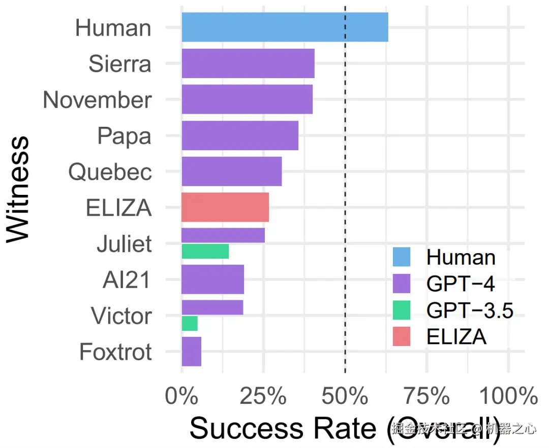 2023 年,加州大学圣迭戈分校(UCSD)的研究人员公开进行了一次图灵测试,目的是比较最新的 LLM 与 20 世纪 60 年代开发的聊天机器人 Eliza 的表现。在律师资格考试中获得高分的 GPT-4 表现相当出色,在 41% 的游戏中,评委认为它与人类无异。而它的前身 GPT-3.5 只通过了 14% 的游戏,低于 Eliza 的 27%。人类在 63% 的游戏中通过(被判定为人类)。