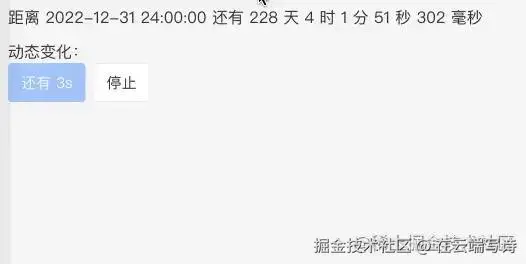 <div> 距离 2022-12-31 24:00:00 还有 {days} 天 {hours} 时 {minutes} 分 {seconds} 秒 {milliseconds} 毫秒</div>