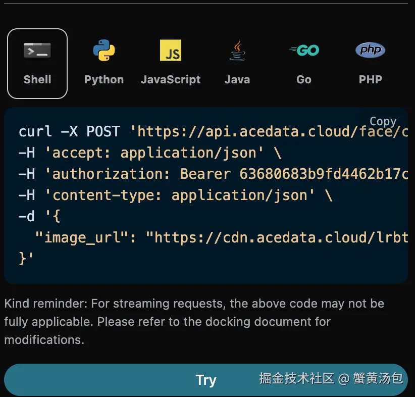 另外如果想生成对应的对接代码,可以直接复制生成,例如 CURL 的代码如下: