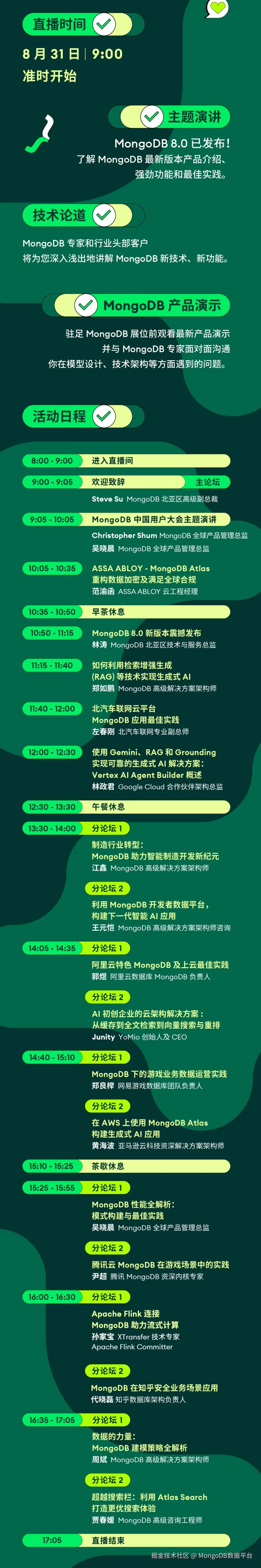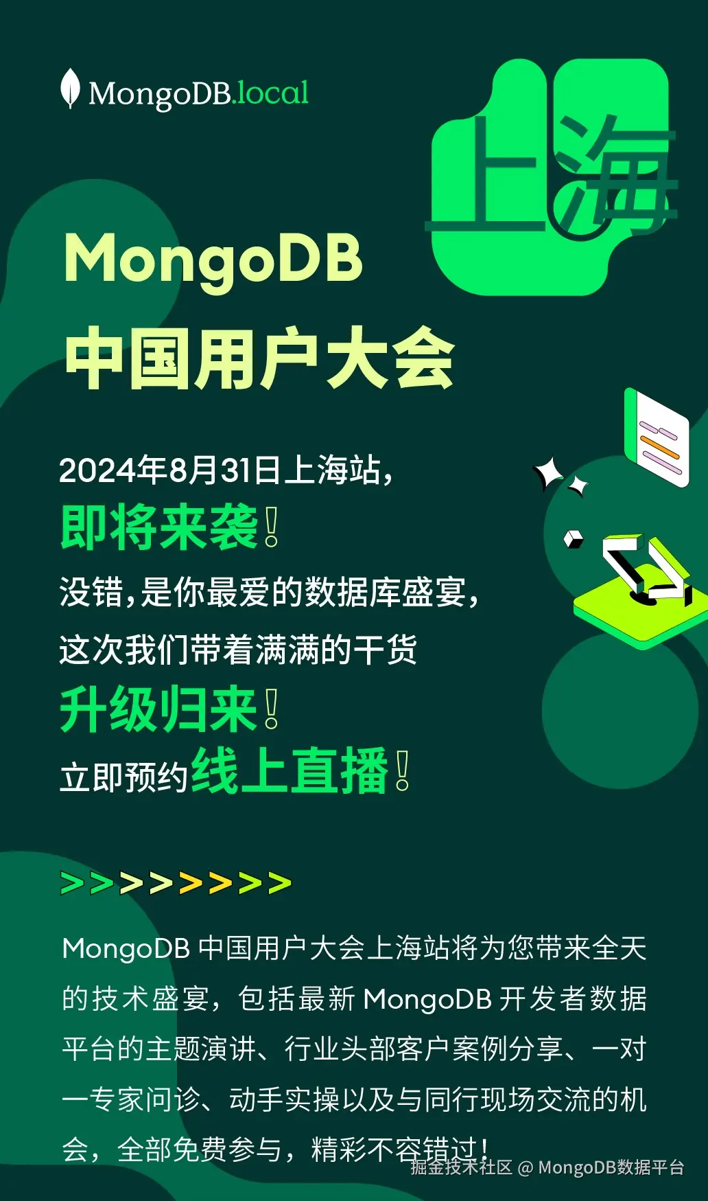 2024 MongoDB中国用户大上海站活动就在明天!欢迎您到现场参加大会了解MongoDB最新产品及技术介绍。若您无法参加MongoDB 中国用户大会上海站的线下活动,我们也同时准备了全程的线上直播,请扫码二维码预约报名。若您明天不能全程在线,也欢迎您注册,后续大会将发送视频回放链接及大会演讲PPT给注册报名的用户。期待您的热情报名参与!