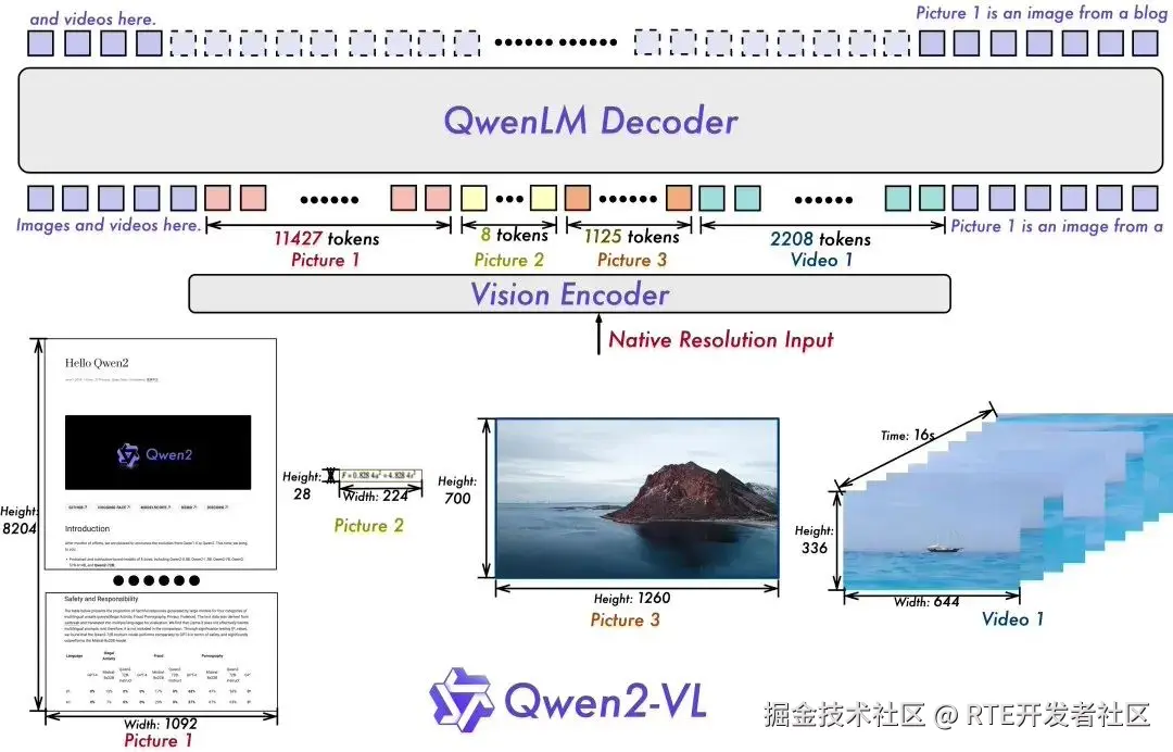 Qwen2-VL 的一项关键架构改进是实现了动态分辨率支持(Naive Dynamic Resolution support)。与上一代模型 Qwen-VL 不同,Qwen2-VL 可以处理任意分辨率的图像,而无需将其分割成块,从而确保模型输入与图像固有信息之间的一致性。这种方法更接近地模仿人类的视觉感知,使模型能够处理任何清晰度或大小的图像。