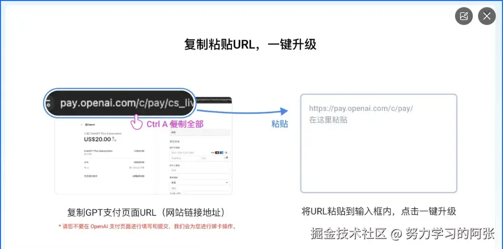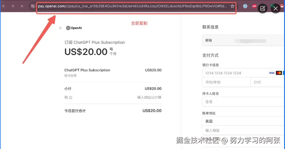 在支付页面,复制现在的付款页网址 URL,这一段 pay.openai.com 开头的全部网址,进入我们「一键升级 ChatGPT Plus」页面,提交就可以了。不要在支付页面填写任何信息,如果填写过,要返回上一步,重新进入这个页面再复制网址。