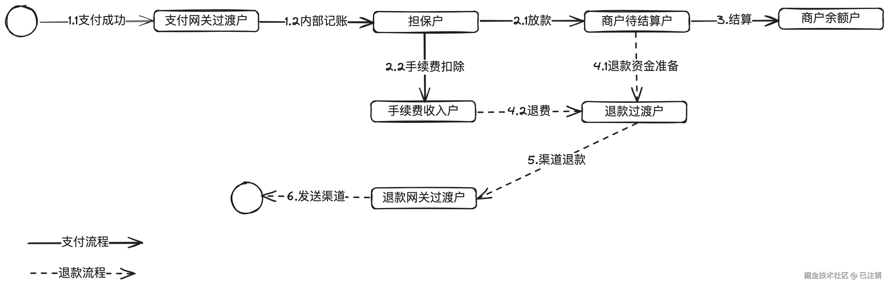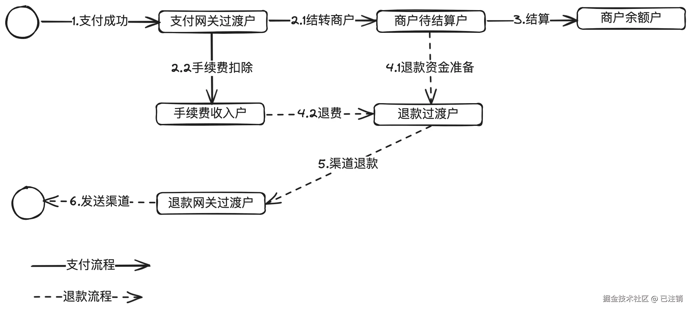 退款则相反,在退款资金准备阶段需要从商户待结算户到退款网关过渡户。