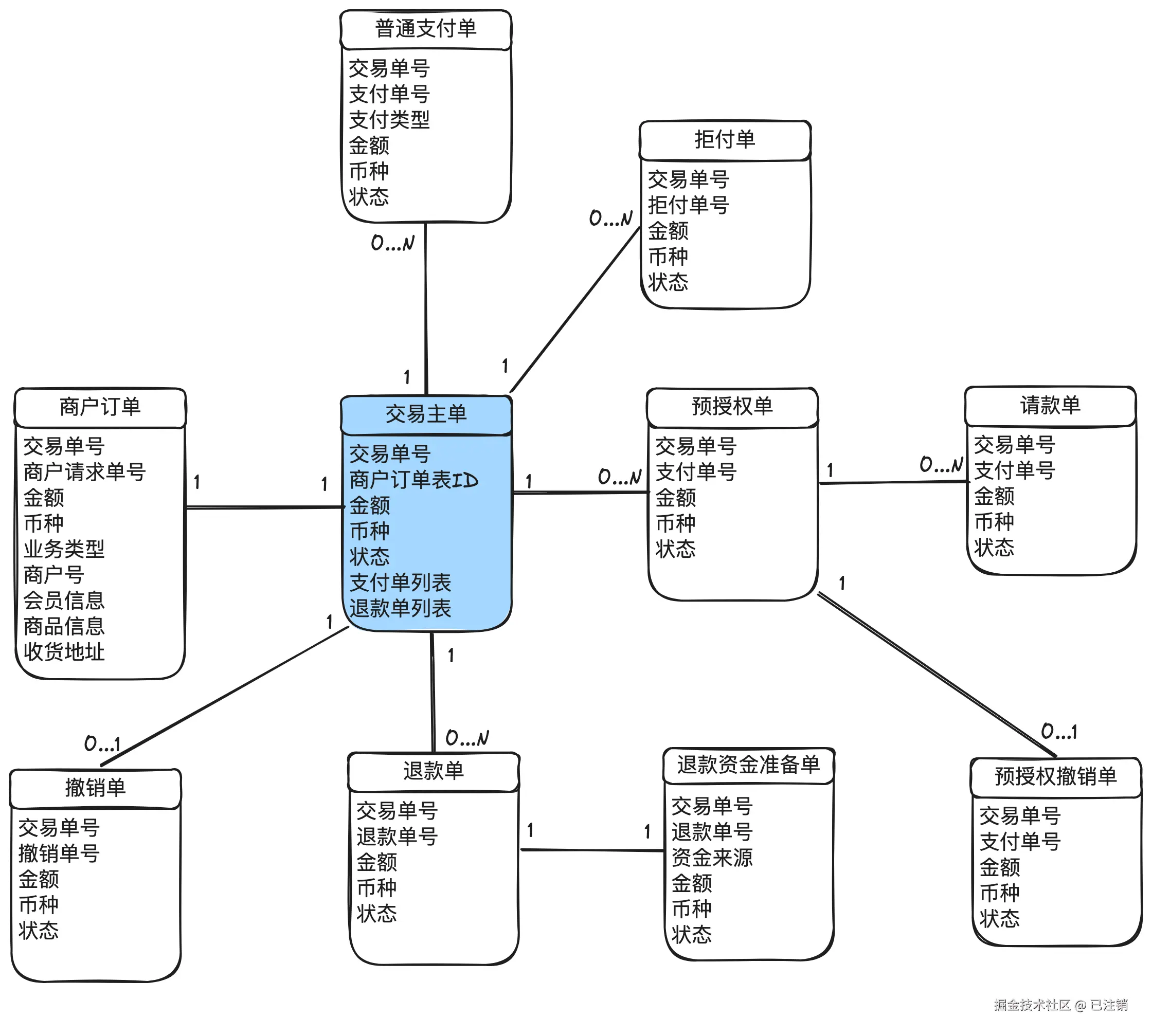 从图中也可以看出,最核心是交易主单,所有其它单据都与交易主单关联。