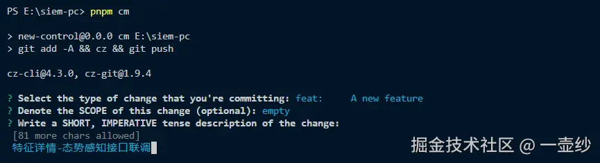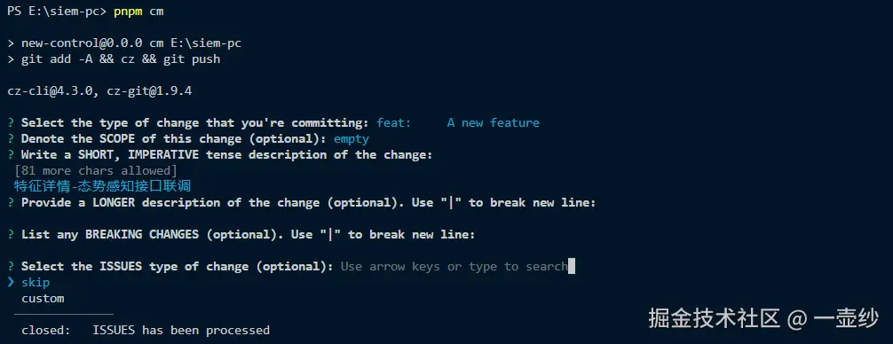 - cz-git:这是 Commitizen 的一个插件,提供了一个交互式命令行界面,用于生成符合规范的 git 提交信息。