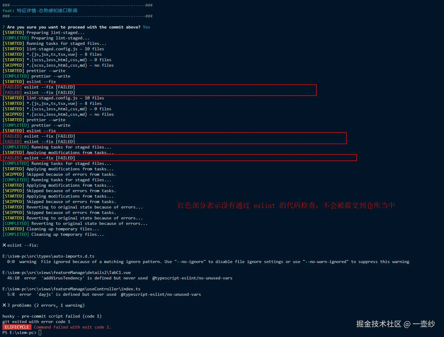 # 只有 error → 退出码非0 → git 提交被阻止
