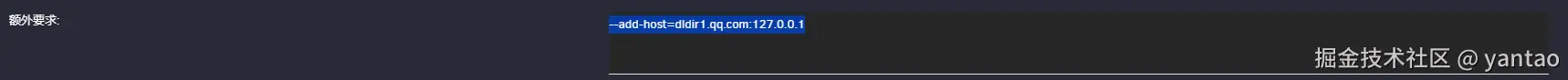 这里还有一个额外参数,官方是这么写的,具体不写是否启动不了,这个不太清楚,但是还是加进去把。打开高级 模式,再额外要求里面加入:--add-host=dldir1.qq.com:127.0.0.1